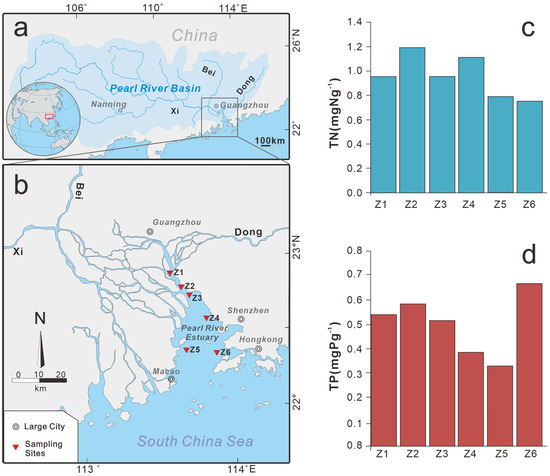 (a) Water system map of the Pearl River Basin. (b) Sketch map of the study area and sampling sites (modified from [40,41]). (c) Total nitrogen (TN) and (d) total phosphorus (TP) content in the surface sediments (0–5 cm) in the Pearl River Estuary, China.