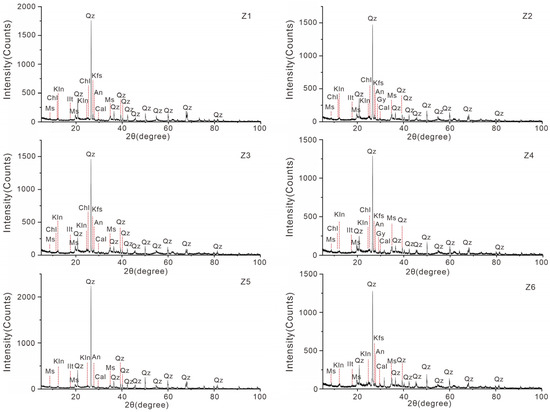 The XRD results of the surface sediments (Z1–Z6). Mineral abbreviations: Qz—quartz; Ms—muscovite; An—anorthite; Kfs—K-feldspar; Gy—gypsum; Cal—calcite; Chl—chlorite; Kln—kaolinite; Ill—illite.
