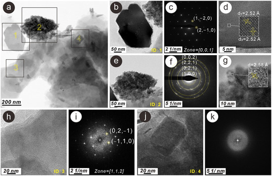 (a) TEM image of N-bearing and P-bearing nanoparticles (ID:1–4); the EDS results are shown in Figure 4 and Table 2. (b–d) HR-TEM images and SAED pattern of an N- and P-bearing hematite nanoparticle (ID: 1). (e–k) HR-TEM images and SAED pattern of an N- and P-bearing goethite nanoparticle aggregation (ID: 2). (h,i) HR-TEM image and fast Fourier transform (FFT) pattern of an N-bearing muscovite nanoparticle (ID: 3). (j,k) HR-TEM image and FFT pattern of a Ca phosphate nanoparticle (ID: 4).