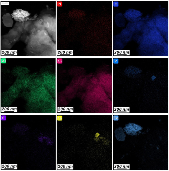 Figure 3a shows several nanoparticles, and the representative nanoparticles (Table 2, ID: 1–4) were observed and analyzed in detail (Figure 3b–k). The primary compositions and characteristics of these nanoparticles are shown in Figure 4 and Table 2. The nanoparticles in Figure 3a are mainly composed of N, O, Al, Si, P, S, Ca and Fe, and the distribution of the main elements is shown in Figure 5. Figure 3b shows an irregular nanoparticle (ID: 1) with a size of approximately 150 nm × 200 nm. The EDS results show that the main components of this nanoparticle included O and Fe, with minor amounts of N, Si, Al, P, etc. Based on the SAED pattern and HR-TEM image (Figure 3c,d), the d-spacings measure d1 = d2 = 2.52 Å, and the SAED pattern corresponds to the zone axis = [001] of hematite (Fe2O3, PDF#87-1165), suggesting an N- and P-bearing hematite nanoparticle. Figure 3e shows an irregular nanoparticle aggregation (ID: 2), and a total size of approximately 150 nm × 200 nm. The EDS results indicate that the aggregation mainly consists of O and Fe, with minor amounts of Al, Si, N, P, etc. Based on the SAED pattern and HR-TEM image (Figure 3f,g), the d-spacings measure 2.58 Å, and the polycrystalline diffraction rings in SAED pattern correspond to the crystalline planes of goethite (α-Fe3+O(OH), PDF#29-0713), indicating an N- and P-bearing goethite nanoparticle aggregation. Figure 3h shows a layer nanoparticle with a size of approximately 50 nm × 100 nm. The EDS results indicate that this layer nanoparticle mainly comprises O, Si and Al, with small amounts of K, N, F, Mg and Fe. The FFT pattern corresponds to the zone axis = [112] ofmuscovite-2M (KAl2 (Si3Al) O10(OH, F)2, PDF#06-0263), suggesting an N-bearing muscovite nanoparticle. Figure 3j shows a nearly rectangle nanoparticle (ID: 4) with a size of approximately 50 nm × 120 nm. The EDS results indicate that the nanoparticle primarily consists of O, Si, Ca, Al and P, with minor amounts of N, F, K, Fe, etc. However, the HAADF-STEM image and elemental TEM distribution (Figure 5) show that the nearly rectangular nanoparticle has been adsorbed onto the surface of the layered silicate nanoparticle. Therefore, we suggest that the Si, Al, K and F in this position (ID: 4) belong to layered silicate. In addition, the nearly rectangular nanoparticle mainly consists of O, Ca and P, suggesting that it is a calcium phosphate nanoparticle. Moreover, none of the diffraction spots are shown in the FFT pattern (Figure 3k), indicating that this particle is amorphous.
