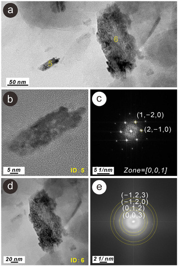 (a) TEM image of N- and P-bearing nanoparticles (ID: 5–6); the EDS results are shown in Figure 7 and Table 2. (b,c) HR-TEM image and FFT pattern of an N- and P-bearing hematite nanoparticle (ID: 5). (d,e) HR-TEM image and FFT pattern of an N- and P-bearing hematite nanoparticle aggregation (ID: 6).