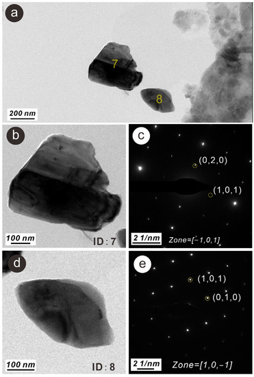 (a) TEM image of two N- and P-bearing nanoparticles (ID: 7–8); the EDS results are shown in Figure 9 and Table 2. (b,c) HR-TEM image and SAED pattern of an N- and P-bearing anorthite nanoparticle (ID: 7). (d,e) HR-TEM image and SAED pattern of an N- and P-bearing quartz nanoparticle (ID: 8).