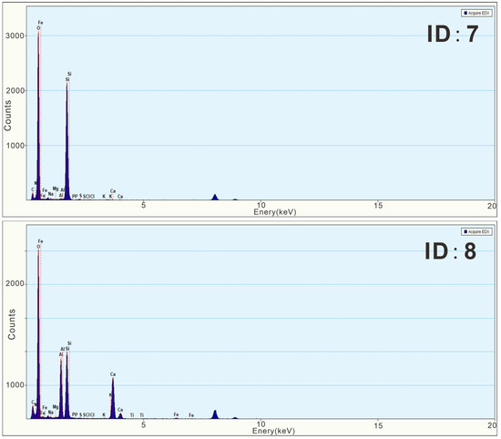 Figure 8a shows two irregular N- and P-bearing nanoparticles (ID: 7–8), and the EDS results are shown in Figure 9 and Table 2. An irregular nanoparticle (ID: 7) is shown in Figure 8b, with a size of approximately 250 nm × 400 nm. The EDS results indicate that the nanoparticle primarily consisted of O, Si, Ca and Al, with small amounts of N, P, S, Fe, etc. The SAED pattern corresponds to the zone axis = [01] of anorthite (CaAl2Si2O8, PDF #86-1707), suggesting that it is an N- and P-bearing anorthite nanoparticle. Figure 8d shows an irregular nanoparticle (ID: 8) with a size of approximately 150 nm × 250 nm. The EDS results indicate that the nanoparticle primarily consists of O and Si, with a minor amount of N, P, Na, Mg, Al, etc. The SAED pattern correspons to the zone axis = [10] of quartz (SiO2, PDF #83-0541), suggesting an N- and P-bearing quartz nanoparticle.