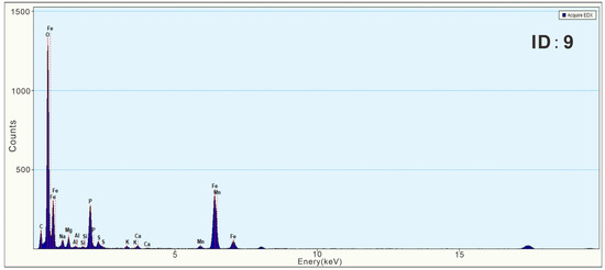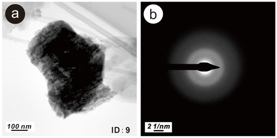 Figure 10a shows a P-bearing irregular nanoparticle (ID: 9) with a size of approximately 250 nm × 400 nm. The EDS results are shown in Figure 11 and Table 2; the nanoparticle primarily consists of O, Fe and P, with small amounts of S, Mn, Na, Ca, Mg, etc. The HAADF-STEM image and elemental TEM maps (Figure 12) show that the main composition elements O, Fe and P were homogeneously distributed in the nanoparticle; we speculate that the nanoparticle was composed primarily of ferric phosphate. In addition, none of the diffraction spots are shown in the SAED pattern (Figure 10b), indicating that this particle was amorphous.