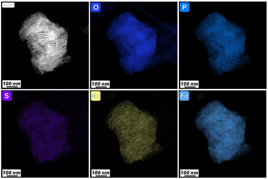 HAADF-STEM image and O, P, S, Mn and Fe TEM maps of the Fe phosphate nanoparticle (ID: 9).