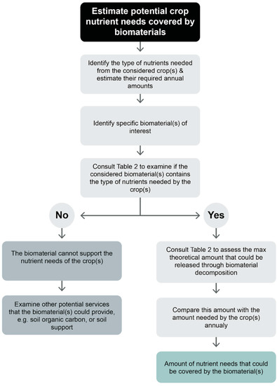 A decision tree was developed to assess the potential contributions of specific biomaterials to support the nutrient needs of crops grown in regenerative farms (Figure 3). The nutrient requirements of the crops under consideration are first identified and quantified. Then, the nutrient content of specific biomaterials is estimated using Table 2. If the required nutrients are present in biomaterials’ composition, the maximum theoretical amount of these nutrients that could be released during biomaterials’ decomposition are calculated. This amount is then compared with crops’ needs to assess the potential biomaterials contribution.