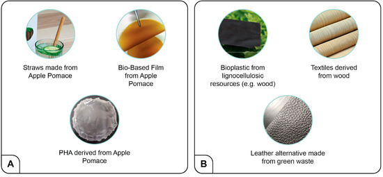 | Apple pomace | 39% | 29% | 20% | 12% | Apple-pectin leather, biopolymer films, fiberboards and biocomposites after mixing w/pectin, citric acid, glycerol, or biopolymers | [56,57,58,59] |