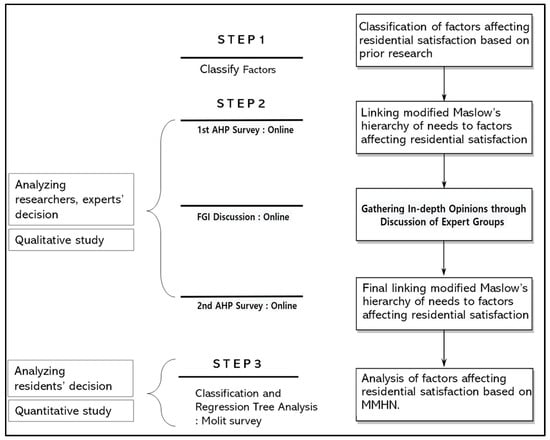 In this study, the following three-stage qualitative and quantitative integrated experiment was designed to link factors affecting residential satisfaction and the MMHN. First, residential satisfaction factors were identified based on prior research (see the residential satisfaction factors listed in Table 1). Second, an AHP survey was designed to link the identified residential satisfaction factors with the MMHN. The preliminary AHP was conducted with a group of researchers in the housing sector to identify the connection between residential satisfaction factors and the MMHN. Then, based on the results of the survey, an FGI was conducted with various experts in the housing sector. At this stage, the outcomes of the preliminary AHP were further concretized through an in-depth and realistic discussion of each item to be linked between residential satisfaction factors and the MMHN. Following the FGI with the expert group, a second AHP survey was carried out with the same experts to systematize the final linkage between the MMHN and residential satisfaction factors. The AHP surveys and FGI were conducted with approval from the Korea Advanced Institute of Science and Technology’s institutional review board. Finally, the residential satisfaction factors systematized based on the MMHN, formulated as described above, were applied to the MOLIT’s Korea Housing Survey data for 2020 []. The overall process of this study is summarized in Figure 2.