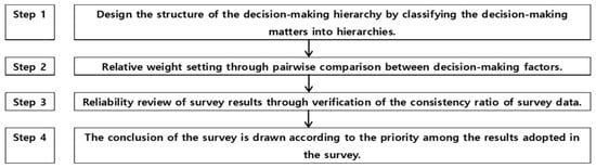 The reason this method is appropriate for this study is that it can be used to reflect experts’ perceptions of a phenomenon during evaluation. AHP is also suitable because it asks experts to rank the relative importance of relevant elements and utilizes surveys with a ratio scale for decision-making; thus, it can convert qualitative opinions into quantitative values for analysis [] through the ratio scale [].