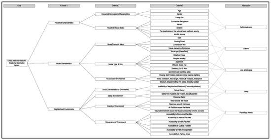 An objective determination of which stages of Maslow’s hierarchy of human needs are closely linked to which residential satisfaction factors requires a quantitative evaluation of the qualitative elements. To address this matter, in this study, we used decision analysis to make reasonable and logical decisions in uncertain circumstances. The analytic hierarchy process (AHP) was utilized as the decision analysis method. Developed by Thomas L. Saaty, AHP is a decision-making method used to capture an evaluator’s knowledge, experience, and intuition through judgment made via pairwise comparison of different elements []. Canco confirmed that AHP is an efficient method for decision-making that involves numerous different criteria [].
