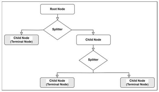 A node is a branching point in a decision tree that corresponds to a set of data. The root node is the uppermost node in a tree that contains every observation in the dataset. The parent node is the node being divided, whereas the nodes derived from the division are child nodes. The terminal node is a node that is no longer divided. The advantages of decision trees include easy interpretation and explanation, easy handling of qualitative predictors, and broad applicability to both classification and regression problems []. Various algorithms can be used to construct decision trees, including CART, ID3, C4.5, C5.0, CHAID, and MARS [].
