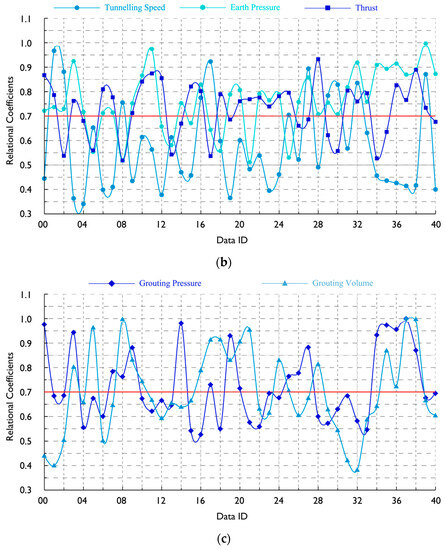 - While the grouting parameters did not exhibit the highest relational degrees, they still held prominent positions [40]. Notably, grouting pressure contributes slightly more to surface settlement than grouting volume. In addition, as shown in Figure 4c, the relational coefficients between the two are higher in the fractured zone than in other intervals. Therefore, ensuring the stability of grouting pressure and controlling the grouting volume are both critical for achieving the optimal grouting effect.