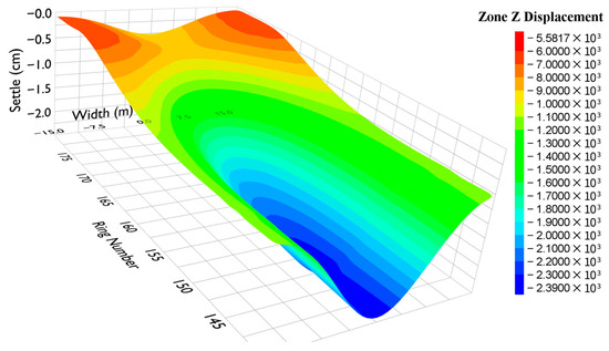- As indicated in previous studies [18,36], the influence of grouting pressure on surface settlement is evident. Moreover, it greatly influences the settlement trough width in weak strata (Figure 7c). Increasing grouting pressure from 134 kPa to 334 kPa decreases the settlement trough from 10 m to 6 m. Somewhat differently from a previous study [40], no surface uplift occurs, likely due to reasonable grouting pressure within the soil’s bearing capacity.