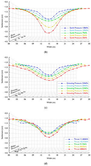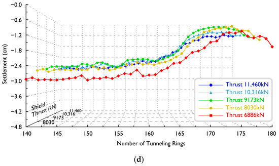 - Thrust magnitude directly affects the final surface settlement [33] (Figure 8d). Excessive thrust that is beyond the strata’s resistance during tunnelling leads to a significant surface settlement with surface uplift and subsequent sinking after shield tunnelling. Similarly, insufficient thrust results in incomplete compensation of strata displacement, leading to an increase in surface settlement.