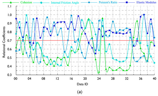 - Grey relational coefficients above 0.7 indicate significant correlations between certain parameters and surface settlement. Figure 4a shows that the relation of cohesion and internal friction angle with the surface settlement is relatively low within the Data ID range of 9–15 (corresponding to tunnelling rings 280–247). Similarly, in the interval of Data ID 34–38 (corresponding to tunnelling rings 65–41), the relation between Poisson’s ratio and surface settlement is also notably low, which corresponds to fractured zone areas. This indicates a weak correlation between stratum parameters (excluding elastic modulus) and surface settlement within the fractured zone region.