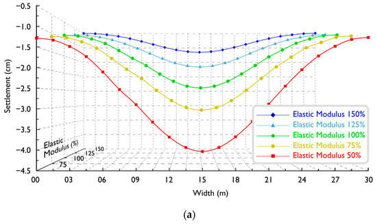 As illustrated in Figure 7 and Figure 8, it is important to note that the elastic modulus of the stratum has a significant influence on the surface settlement. Given its inherent property as a critical stratum parameter, precise characterization of the elastic modulus can provide a direct link to the potential surface settlement and offer a scientific basis for developing effective mitigation strategies. Geotechnical investigations and predictive modelling before shield tunnelling are required. In addition, it is advisable to conduct geological predictions in advance and promptly adjust construction parameters based on real-time stratum conditions during tunnel evacuation. In regions with small elastic moduli, suitable reinforcement measures like pre-excavation grouting or enhanced ground stabilization are also recommended.