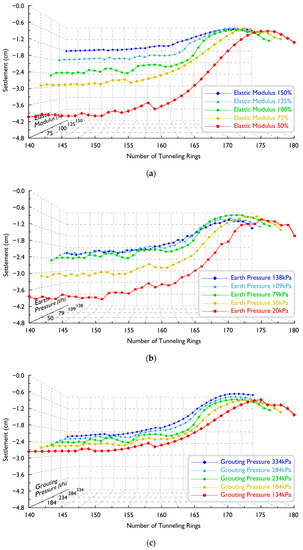 - As indicated in previous studies [18,36], the influence of grouting pressure on surface settlement is evident. Moreover, it greatly influences the settlement trough width in weak strata (Figure 7c). Increasing grouting pressure from 134 kPa to 334 kPa decreases the settlement trough from 10 m to 6 m. Somewhat differently from a previous study [40], no surface uplift occurs, likely due to reasonable grouting pressure within the soil’s bearing capacity.