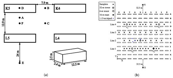 MUST experiment schematic; (a) Dimensions and source locations, (b) Top planar view with samplers locations.