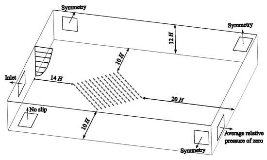 The pollutant dispersion within a compact urban setting is modeled on a high-resolution grid using the ANSYS CFX commercial code. The 3D steady-state RANS equations coupled with the Eulerian transport equation are discretized and solved by employing the hybrid finite element/volume method. High-resolution schemes are considered to evaluate advection terms and turbulence numerics, and the Rhie–Chow algorithm was adopted to implement pressure-velocity coupling. To ensure convergence of the solution, target values of root mean square (RMS) normalized residuals were set to and for flow variables and tracer concentrations, respectively. The minimum size of the computational domain was determined based on the recommendations of Tominaga et al. [] and Franke et al. []. The additional domain sizes were examined to specify the proper dimensions for the MUST geometry to eliminate the possibility of any artificial flow accelerations around the buildings and destructive backflow at the boundaries. Taking the height of the obstacles as H, distances from the MUST array are revised to from the inlet, from lateral boundaries, from the outlet, and from the top boundary. This ensures that the results are domain independent. Figure 2 illustrates a schematic of the computational domain. As can be seen, the rectangular domain is oriented so that the inflow wind stream is perpendicular to the inlet and outlet faces.
