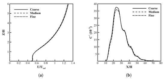 Following the “best-practice” guidelines in computational wind engineering, the sensitivity of the CFD model results to the grid resolution should be carefully assessed []. In this regard, three successive grid resolutions of coarse, medium, and fine were examined with , , and million computational nodes, respectively. The vertical profile of normalized velocity at the central 32 m tower and the horizontal profile of normalized pollutant concentration at the second sampling line are compared to assess the uncertainty of results due to the grid size. As Figure 3a illustrates, there are trivial deviations between the resultant velocity profiles using all three grid refinements, which necessitates evaluating a more sensitive variable (i.e., concentrations). Figure 3b, however, implies that employing the grid with medium refinement would be the appropriate choice with respect to the computational cost and dependency of the predictions to mesh sizes.