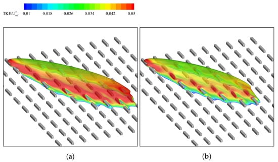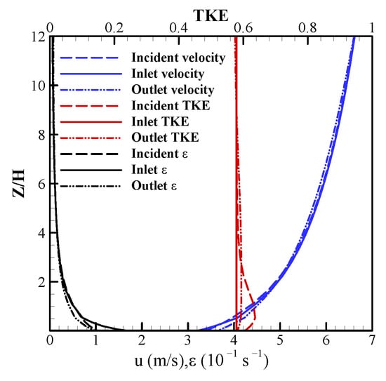 Figure 4 shows the velocity, TKE, and dissipation rate at three cross-sections in an empty domain. As can be seen, the horizontal homogeneity for the velocity and dissipation rate was near completely achieved with a mean average error of and , respectively. However, the TKE profile seems to display a small degree of streamwise inhomogeneity in regions close to the ground, reaching a mean average error of . The analytical solution to the horizontally homogeneous atmospheric boundary layer requires the production of turbulence to be balanced by the dissipation at a constant rate leading to a uniform value for the TKE normal to the ground. However, as indicated in the work of the previous researchers [] and from Figure 4, TKE varies with distance to the ground. The reason for this over-generation of turbulence in the vicinity of the wall in the model was previously discussed by Richards [], and the inconsistent discretization of the turbulence production term at the wall is described as the source of this excessive generation.