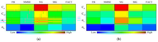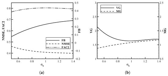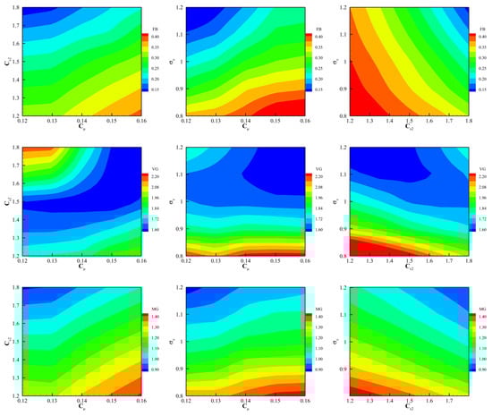 The quality of the predictions within the detected ranges for closure constants that contribute to the highest calculated FAC2 should be further examined. In this regard, the concentration-related output responses of the remaining validation metrics to different sets of closure coefficients are presented in Figure 9. Noting that the calculated NMSE remains well inside the acceptable limits and near its ideal value (), it was decided to mainly focus on the FB, VG, and MG metrics and omit the NMSE variation contours in this paper. As can be seen, both the linear and logarithmic measures of the model’s systematic errors (i.e., FB and MG, respectively) exhibit roughly similar trends in response to the closure modification.