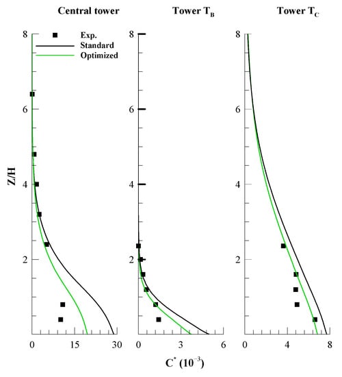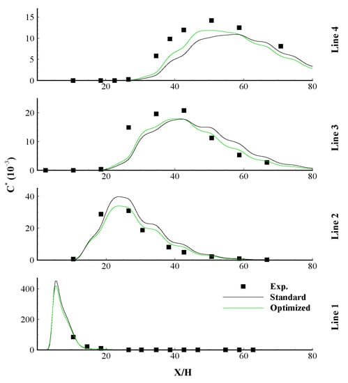 Following the previous endeavors, this study aims to enhance the reliability and generality of the closures in ABL dispersion studies. Based on the presented review, a well-tested set of coefficients that accurately represents the pollutant concentration field within an urban array has yet to be developed. The current research is part of a project to improve the existing practices in dispersion modeling. In our previous paper, the effects of several critical modeling decisions (e.g., closure model, inflow boundary conditions, computational domain size, and turbulent Schmidt number) were investigated, and a relatively efficient framework was introduced []. Considering different venting scenarios (i.e., various source locations), the standard model coupled with the locally variable turbulent Schmidt number (Sc) was found to be the most efficient setup with the least calculated deviations from field measurements. Therefore, the present study conducts a thorough optimization of the standard closure by incorporating the recommended modeling settings.