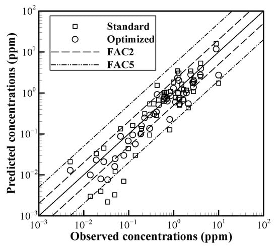 For this reason, two linear measures of FB and NMSE for the predicted concentration field, and their logarithmic counterparts, MG and VG, are also included in the objective function. Figure 5 displays a drop for both FB and MG as and increase, while opposite trends are shown for and . Given the definition of the validation metrics, smaller amounts of FB and MG indicate stronger scalar dispersion and lower predicted concentrations at sampling points. It is worth noting that a VG greater than 1 and positive values of FB reflect under-predictions of the concentration field. However, due to the unavoidable presence of compensation errors in the calculations of FB and MG, there may be instances of significantly inaccurate predictions in which these metrics take their ideal values. To avoid such a misinterpretation of the systematic errors, it is necessary to simultaneously calculate and explain NMSE and VG metrics, which also quantify the available random errors (scatter of predictions from measurements) []. Lower values of NMSE and VG that correspond to smaller scatters are shown in Figure 5 to be gained by larger values of and within ranges of to and to , respectively. Conversely, adopting smaller values of between and 2 considerably mitigates the scatters. For ranging from to , the drastic fall of VG compared to the relatively moderate reduction of NMSE suggests that data points with exceedingly low concentrations may have overly influenced this logarithmic measure. Therefore, it is expected that the optimal value of falls within the range of to , which is in agreement with the recommended ranges acquired by analyzing the other validation metrics.