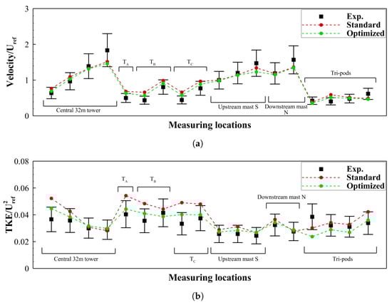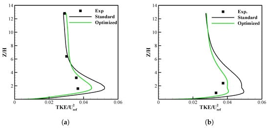 The modification of the standard model was further extended to a more complicated scenario by Guilass et al. [], in which the airflow within a regular street canyon was considered. The authors performed a Bayesian calibration to tune four out of the five constants by excluding and calculating it directly via the correlation between the model constants within the ABL []. The vertical profile of the TKE at the center of the street canyon was considered as the optimization objective, and the results of the 135 CFD runs were processed to determine a set of constants that produced the preferable match with the wind tunnel measurements (, , , , and ). In another work by Zahid Iqbal and Chan [], an investigation of the wind flow field around a cross-shaped building at the pedestrian level was conducted. The modification of the closure model in this attempt was based on the proposed coefficients by Guilass et al. []. The number of unknowns was reduced to simplify the process by just varying at four equal intervals within the range of 0.09–0.12 while keeping the values of and constant, as suggested by Edeling et al. []. Setting the normalized velocity field as the modification objective in their study, was shown to provide the least discrepancies with wind tunnel measurements, though the superiority of the tuned model over the one proposed by Guilass et al. [] was insignificant. This conclusion heightens the importance of calibrating the whole set of coefficients simultaneously to accomplish a worthwhile improvement, in contrast to alleviating the computational complexity by just doing a linear sensitivity study on a selected coefficient.