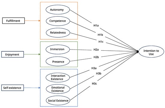 On the other hand, Ryan et al. proposed evaluating the influencing factors of game fun existence and intuitive control [75]. The location of the cultural heritage sites in the AR game’s virtual environment is a complex social space, including the establishment of a psychological connection between the visitor’s virtual self-identity and his or her avatar. Visitors’ participation and the social system have a reciprocal relationship manifested in various forms of interaction. In this case, the virtual self bridges the physical and virtual environments [76]. These perspectives on existence are essential and have a unique role in developing self-existence. Therefore, we make the following hypotheses related to self-existence and cultural heritage experience.