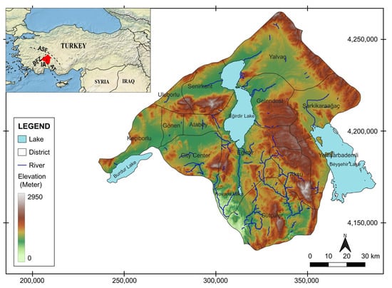 This research focuses on Isparta Province (Figure 1). Isparta Province’s total area is 893,307 ha [], and its population was 445,325 people for the year 2022, according to the address-based population registration system []. The highest altitude in the province reaches a maximum of 2950 m.