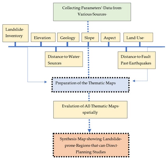 In this study, four main steps are followed: collecting parameter data, evaluating the thematic maps and preparing a synthesis showing landslide-prone regions that can direct planning studies (Figure 2). The methodology is based on a heuristic method. The rationalized approach referred to as “non-weighted bounded indicators” relies on the integration of overlapping thematic maps representing conditioning factors for mass movement []. This approach is also used for determining landslide-prone regions in Isparta. Different from [], as it was focused on the quantification of a susceptibility index for each individual index, this study simply evaluated the togetherness of the multicriteria defined.