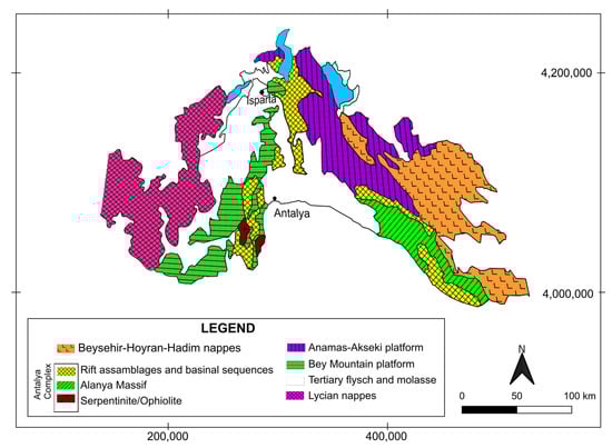- Akbaş, B.; Akdeniz, N.; Aksay, A.; Altun, İ.E.; Balcı, V.; Bilginer, E.; Bilgiç, T.; Duru, M.; Ercan, T.; Gedik, İ.; et al. 1:1.250.000 ölçekli Türkiye Jeoloji Haritası. Maden Tetkik ve Arama Genel Müdürlüğü Yayını, Ankara-Türkiye. 2011. Available online: http://yerbilimleri.mta.gov.tr/referans.aspx (accessed on 19 July 2023).