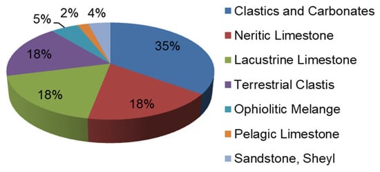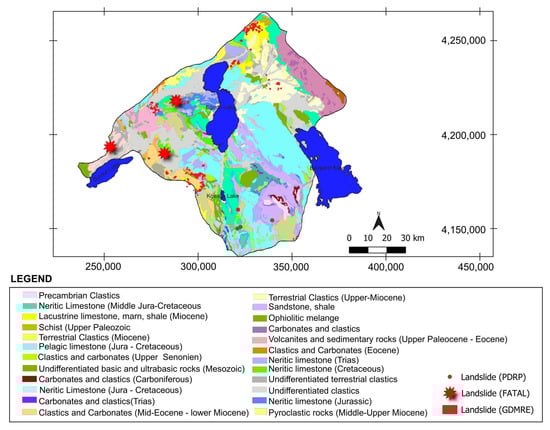 The study area consists of stratigraphic formations, including autochthonous and allochthonous units. The lithological units present in the province are depicted in Figure 4. Upon examining the lithological map, it is observed that the dominant geological units in the area are clastics and carbonates, clastics, neritic, pelagic, and lacustrine limestones. The percentage variations of landslides occurring are attributed to lithology and are given in Figure 5, revealing that clastics and carbonates exhibit the highest landslide percentage at 35%.