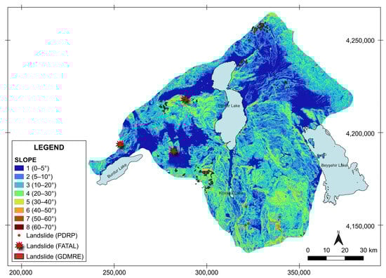 There is a consensus among researchers that the slope is an essential input parameter in landslide susceptibility analyses. Based on the research findings, the slope is a highly preferred choice among the various parameters []. It is widely accepted that the steeper the slope angle, the higher the risk of landslides []. The available literature demonstrated a consensus among researchers regarding the importance of incorporating the slope as a fundamental determinant in the initiation of landslides, thus establishing its widespread use as a parameter in evaluating landslide susceptibility []. The slope exhibits the most significant influence and indispensability concerning landslide susceptibility []. A slope map of Isparta is given in Figure 7.