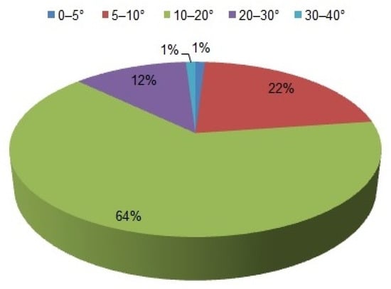 The slope characteristics of the study area have been divided into five distinct categories, as illustrated in Figure 8. Upon analyzing the distribution of landslides based on slope percentages, it has been determined that the highest occurrence of landslides, comprising 64% of the total, is attributed to slopes within the range of 10–20°. Furthermore, slopes ranging from 5 to 10° accounted for 22% of the recorded landslides.