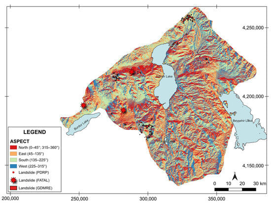 Landslide data specific to Isparta Province were utilized; 3612.60 hectares of the landslide area from [], four landslide events in point data from [], and three fatal landslide events as point data from [] were evaluated in this research. Landslide-prone regions are defined regarding the existence of landslide areas with the parameters defined in the study, including geological setting, seismicity, slope, aspect, water sources, landslide inventory, and land use data. Elevation data for Isparta Province were used to create terrain slope and aspect maps using QGIS 3.32 lima software. Landslides were correlated with earthquakes occurring in the region between 1900 and 2023, as well as the geological characteristics of the area. Furthermore, a land use map was synthesized with information on earthquakes, faults, and rivers. In the generated map, five areas with landslide clusters were identified, and interpretations were made based on their proximity to faults, rivers, and settlements. Additionally, slope, aspect, and lithology distributions for landslide areas were determined using the QGIS program, and statistics were provided.