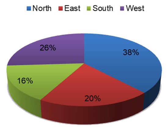 The study area was categorized into four groups based on azimuth angles and reclassified, as presented in Figure 9. When examining the percentage variations of landslides according to aspect, it was determined that the highest occurrence of landslides, at a rate of 38%, was associated with lithologies exhibiting a northern aspect. Following this, west-facing lithologies accounted for 26% of the landslides, east-facing lithologies constituted 20%, and south-facing lithologies accounted for 16% in descending order (Figure 10).