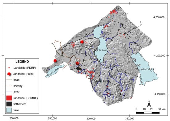 Twelve landslide disaster-prone areas are defined in Isparta IRAP []. Five of them are in Isparta’s Central District, five are in Sütçüler District, one is in Uluborlu, and one is in Yalvaç District. In addition, 3612.60 hectares of the landslide area [], four landslide events in point data [], and three fatal landslide events as point data [] were investigated in this research. This study’s spatial analysis covered human settlements, including urban and rural settlements, in Isparta. At this point, being a spatial database, it differed from Isparta IRAP.