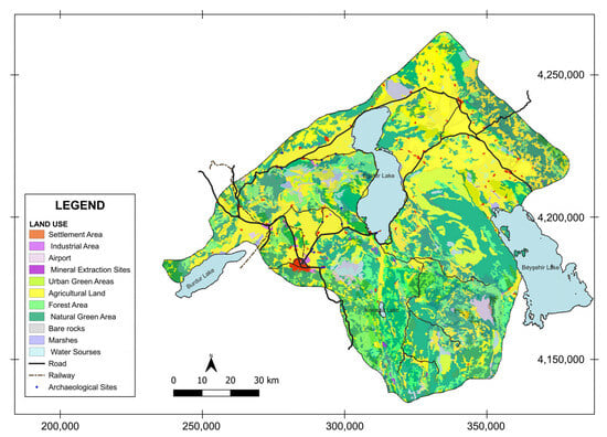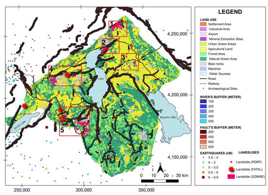 The CORINE land use map was used to categorize land uses into several classes: settlements, industrial, airports, mineral extraction sites, urban green areas, forest areas, bare rocks, marshes, and water sources. In this phase, the existing land cover classes were rearranged to align with the specific objectives of the research. In addition to this classification, road networks, including first, second, and third degrees, were added to the CORINE land use map. Settlement and archeological sites near landslide areas were also added (Figure 12).