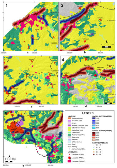 A synthesis of parameters and landslide-prone regions in Isparta was assessed by superposing the various parameters defined in this study (Figure 13). Superposed layers with data on past landslide events provided landslide-prone regions. Accordingly, five landslide-prone regions at the upper scale were determined by the spatial analysis of the parameters and are given in detail in Figure 14a–e. The landslide-prone regions were selected according to the distribution of landslide areas, past landslide events, fault lines and earthquakes, slope, and aspect. In addition, the existence of settlement areas near past landslide events was considered.