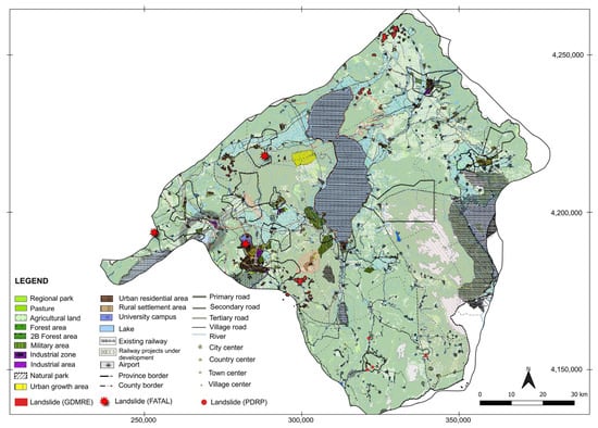 Urban planning plays a crucial role in managing landslide risk [,,]. The most efficient way to mitigate the risk of landslide-related losses is by spreading information about landslide locations and hazards while implementing effective spatial planning []. During the plan preparation phase for landslide-prone areas, necessary measures and precautions can be taken. All types and scales of urban planning documents must consider data about how landslides are distributed across an area to prevent landslides [].