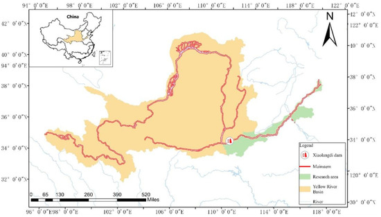 The Xiaolangdi Dam is located in the last section of the Yellow River Gorge (Figure 1), with a total reservoir capacity of 12.65 billion cubic meters, controlling 90% of the Yellow River water and nearly 100% of the sediment transport volume. The Xiaolangdi Dam is the only place on the Yellow River below Sanmenxia that can maintain a large storage capacity and is also the only comprehensive large-scale reservoir that can fully undertake the tasks of flood control, water supply, and irrigation. The Xiaolangdi Dam is the first project in China that is fully compliant with international management practices. It was partly financed by a loan from the World Bank. The main project was subject to comprehensive international bidding, and the personnel involved in the construction came from 51 countries and regions around the world. The dam consists of the dam structure, a flood discharge building, and a power diversion system. The preliminary project was started in September 1991 and the first Xiaolangdi power generation unit was connected to the grid in January 2000. The Xiaolangdi Reservoir has an average annual water regulation capacity of 2 billion m3, which can meet the irrigation and urban water demand in the downstream area, thereby improving the irrigation guarantee rate.
