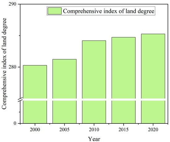 The comprehensive index of land use in each period from 2000 to 2020 in the research area shows that the comprehensive index of land use in the five periods is between 280 and 285, which is categorized as a medium level and shows a rising trend (Figure 3). This indicates that the research area is developing in the direction of urban settlement development.