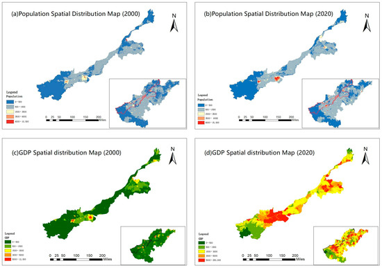 The driving forces of land use change are both natural and human factors. Here, we mainly analyze the relationship between economic society and land use change. As shown in Figure 4, the population and GDP of the study area increased significantly between 2000 and 2020. Compared to 2000, the number of people in the study area increased slightly in 2020, and several densely populated urban patches increased significantly. Compared with 2000, the GDP of the study areas in 2020 had increased significantly. This increase is not only reflected in the densely populated urban patches but also in some areas with previously lower GDP, whose GDP is now close to that of the densely populated urban patches. The change in degree of GDP in the study area is greater than that of population change during 2000~2020, indicating that economic and social indicators are mainly reflected in GDP. As shown in Table 4, from 2000 to 2020, the research area population index increased by 21.13%, and the research area GDP index (yuan/km2) increased by 903.66%. The increase in GDP index is significantly higher than that of population growth, indicating that the growth of economic and social indicators is mainly reflected in GDP growth, which is consistent with the results in Figure 4.