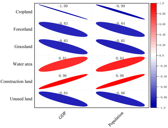 The Pearson correlation coefficient and significant difference analysis between the six land use types in the study area, and the corresponding population and GDP in the same period, were then calculated. The Pearson correlation coefficient can reflect the degree of close correlation between land use type and socio-economic indicators [20]. The correlation coefficient is expressed by r. When |r|∈ [0.8, 1], there is a strong correlation between variables. When |r|∈ [0.5, 0.8] indicates a moderate correlation between variables. When |r|∈ [0.3, 0.5], it indicates a low correlation between variables. When |r|∈ [0, 0.3], there is weak or no correlation between the variables. Double-tail test analysis was used to calculate the significance difference using the p-value. If the p-value is less than 0.05, it indicates that there is a significant correlation between the two variables.