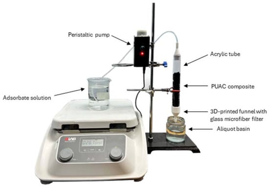 Laboratory-scale fixed-bed column setup using polyurethane-activated carbon composite (PACC) as a sorbent material.