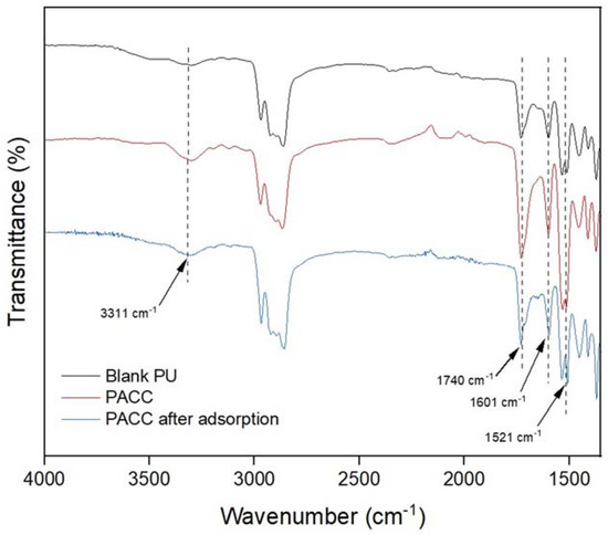 In addition to their physical characteristics, the adsorption capacity of PU and AC can also be influenced by their chemical composition. Although the porous structure is important, the chemical structural attributes of these materials (i.e., their functional groups) can also have an impact on their adsorption capacities [32,33]. FTIR spectroscopy was used to analyze the chemical characteristics of PU and PACC adsorbent foams, as illustrated in Figure 3. The significant peak at 3311 cm−1 is associated with the O-H bonds present in the foam samples. Additionally, the heightened intensity of the peak at 3311 cm−1 in PACC is ascribed to the inherent OH (hydroxyl) groups existing in its AC constituent. This suggests that PACC harbors a greater abundance of OH groups compared to the blank PU, consequently manifesting a more negatively polar chemical structure. Furthermore, the identified peak at 1740 cm−1 is associated with the stretching vibrations of C=O, which are linked to the urethane component within the foam samples [34]. The peaks at 1601 cm−1 correspond to the bending vibrations of C=O, which can be linked to the urethane components, and the stretching vibrations of C-O in carboxylic acids present on the AC surfaces [35]. The peaks at 1521 cm−1 correspond to the bending of N-H and the stretching vibrations of C=O, which can be ascribed to the existence of urethane bonds and carboxyl groups within the PACC matrices. It is worth highlighting that the significant increase in the mentioned peaks found in PACC compared to the blank PU can be attributed to the presence of AC in the PACC matrix. Furthermore, the observed reduction of the oxygen- and nitrogen-related peaks on the FTIR spectrum of PACC after adsorption reveals the reduction of functional sites, as indicated by the peak intensity reductions found at 3311 cm−1, 1740 cm−1, 1601 cm−1, 1521 cm−1, due to the interaction of Pb2+ ions. These observations agree with other research on the role of these peaks in the reaction with Pb2+ [2,36].
