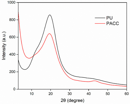 XRD profile of a blank polyurethane (PU) and polyurethane-activated carbon composite (PACC).