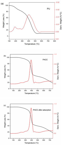 TGA-DTG curves of (a) polyurethane (PU), (b) polyurethane-activated carbon composite (PACC), and (c) PACC composite after adsorption.